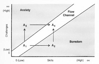 The fact that different players desire to be in a different place with respect to the degree of challenge connects notably with the psychological model of flow. The flow channel (depicted), where abilities and challenge are equal, is an area, not a line. When ability outstrips challenge, boredom results, when challenge outstrips ability, anxiety results. Hard agon therefore lies near the top of the flow channel – where the player is close to their limits. Easy agon lies near the bottom of the flow channel – where the player faces just sufficient challenge to entertain. ‘True agon’ lies in the centre of the flow channel. Perhaps finding means to chart a player's position in the flow channel will allow for an automated game balancing system in the future. [It didn’t, but it was a nice idea!]